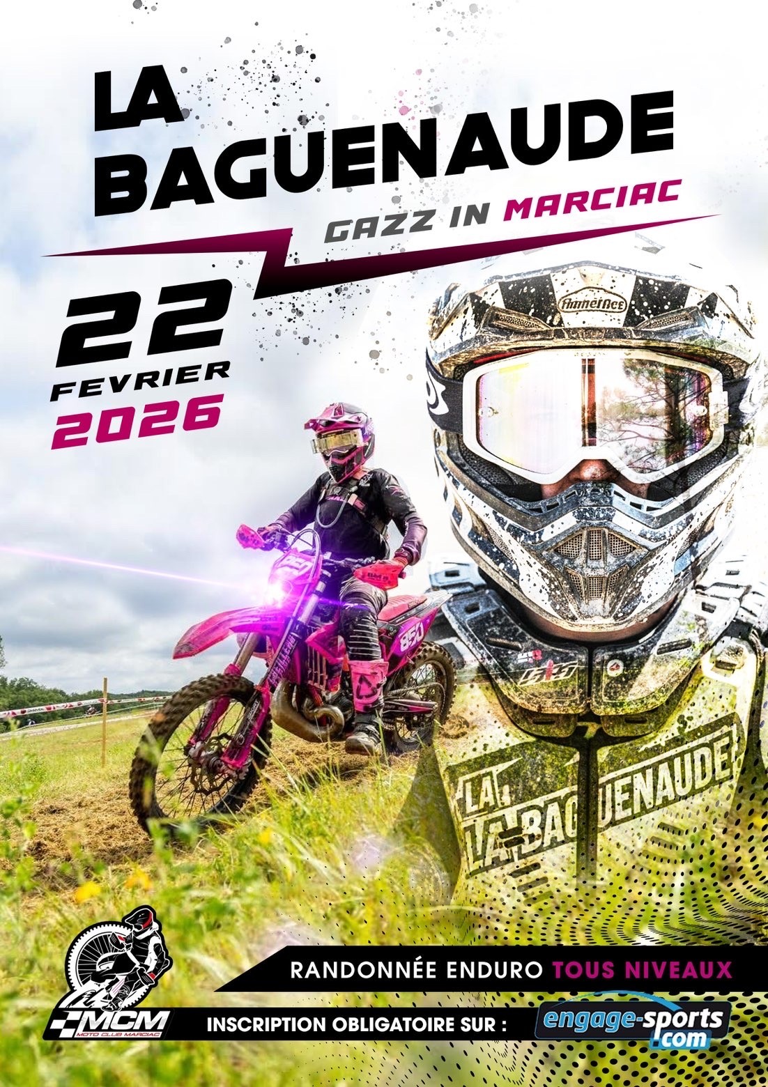 Le Moto-Club de MARCIAC organise une nouvelle édition de "LA BAGUENAUDE", le dimanche 22 Février 2026, une randonnée moto tout terrain typée enduro, accessible à tous avec un minimum de maîtrise en moto. Le tracé boisé comporte des déviations/échappatoires, (principe du SOFT/HARD), et un tracé "pluie" avec des déviations supplémentaires est prévu en cas de mauvais temps. Non-licenciés acceptés.